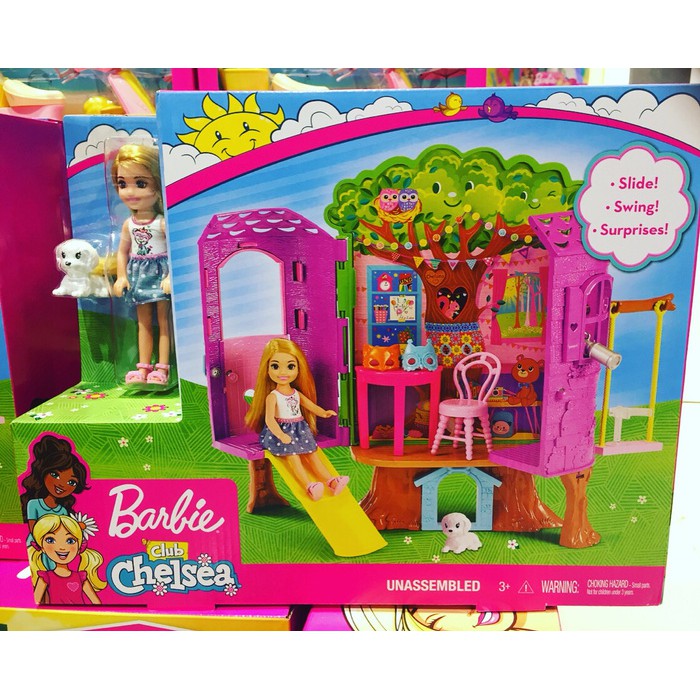 Buy barbie doll chelsea treehouse playset multi color online at low price in india on amazonin. Elevate dollhouse play with chelsea doll her puppy and her treehouse play set. The barbie chelsea doll and treehouse playset includes the iconic chelsea doll a puppy treehouse telescope chairs juicebox a cupcake and two masks for easily playing out various scenarios for an enjoyable time. I love the treehouse theme and the little doghouse underneath where the cute little white dog included and her doggy friends from other barbie sets like the grill can play together or nap all day.