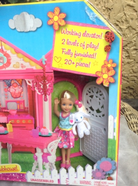 Chelsea clubhouse clubhouse features a kitchen with appliances that really open a front door a table 2 chairs picnic food piececount working elevatorteddy bear basket and a second floor with a bed for naps when its time to dream along with chelsea doll in partial softgoods fashion. Her own little doll house to play have slumber parties and invite her friends. Includes clubhouse play set with working elevator chelsea doll wearing skirt and shoes furniture themed pieces and teddy bear. The details in this house are really adorable.