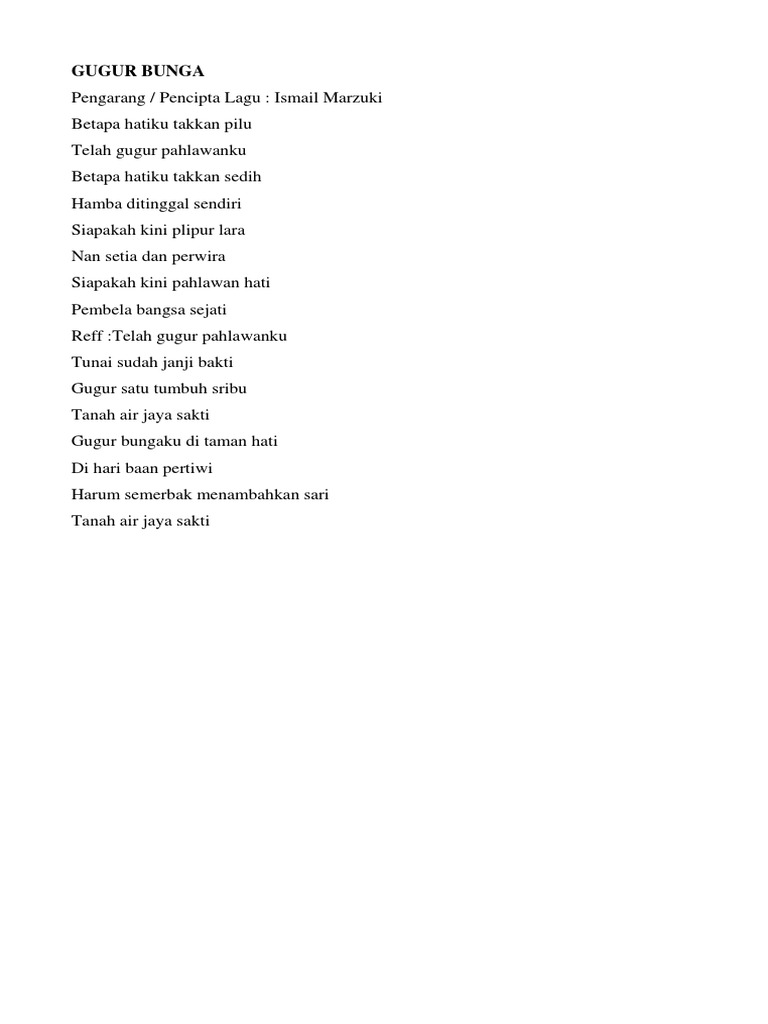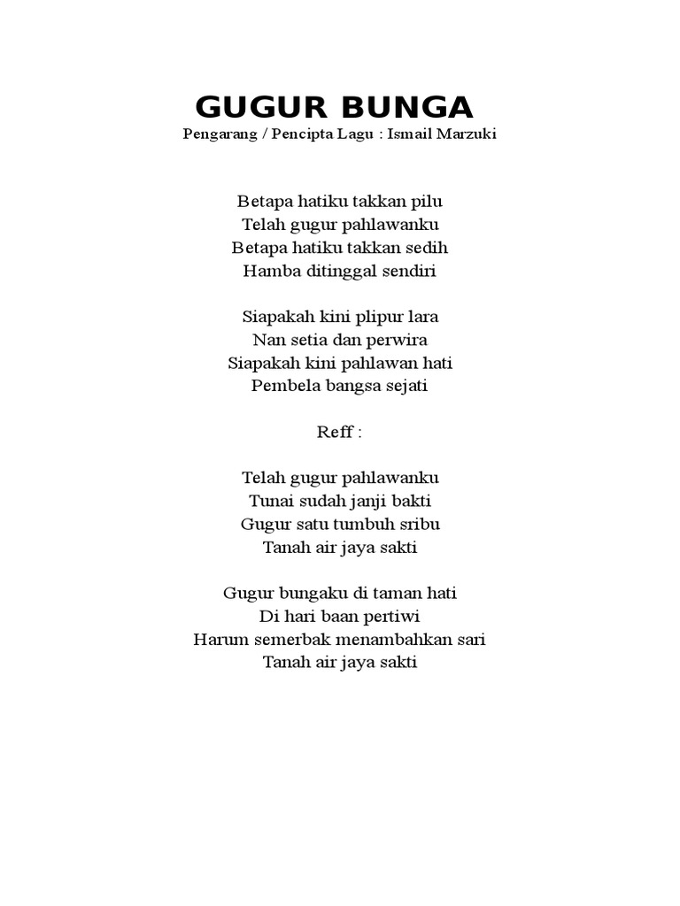 Ismail marzuki betapa hatiku takkan pilu telah gugur pahlawanku betapa hatiku takkan sedih hamba ditinggal sendiri siapakah kini plipur lara nan setia dan perwira siapakah kini pahlawan hati pembela bangsa sejati reff. Pengarang pencipta lagu. Ismail marzuki gugur bunga di taman bakti the fallen flower in the garden of devotion better known as gugur bunga is an indonesian patriotic song written by ismail marzuki in 1945. Telah gugur pahlawanku kunci gitarnya pun sangat mudah untuk dimainkan bagi yang sudah mahir main gitar.