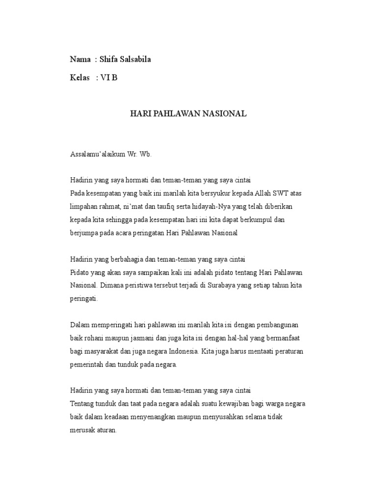 Bukan anak gokil n gaul namanya yang tidak mau mengenang jasa pahlawan dulu. Contoh pidato hari pahlawan hari pahlawan adalah peristiwa sejarah perang antar tentara indonesia dengan belanda yang terjadi pada tanggal 10 november 1945 di kota surabaya. Setiap orang memiliki ciri khas tertentu dalam menyampaikan isi pidatonya. Pembukaan juga berbeda berdasarkan acara tertentu misalkan acara sambutan perpisahan acara resmi dan yang lainnya.