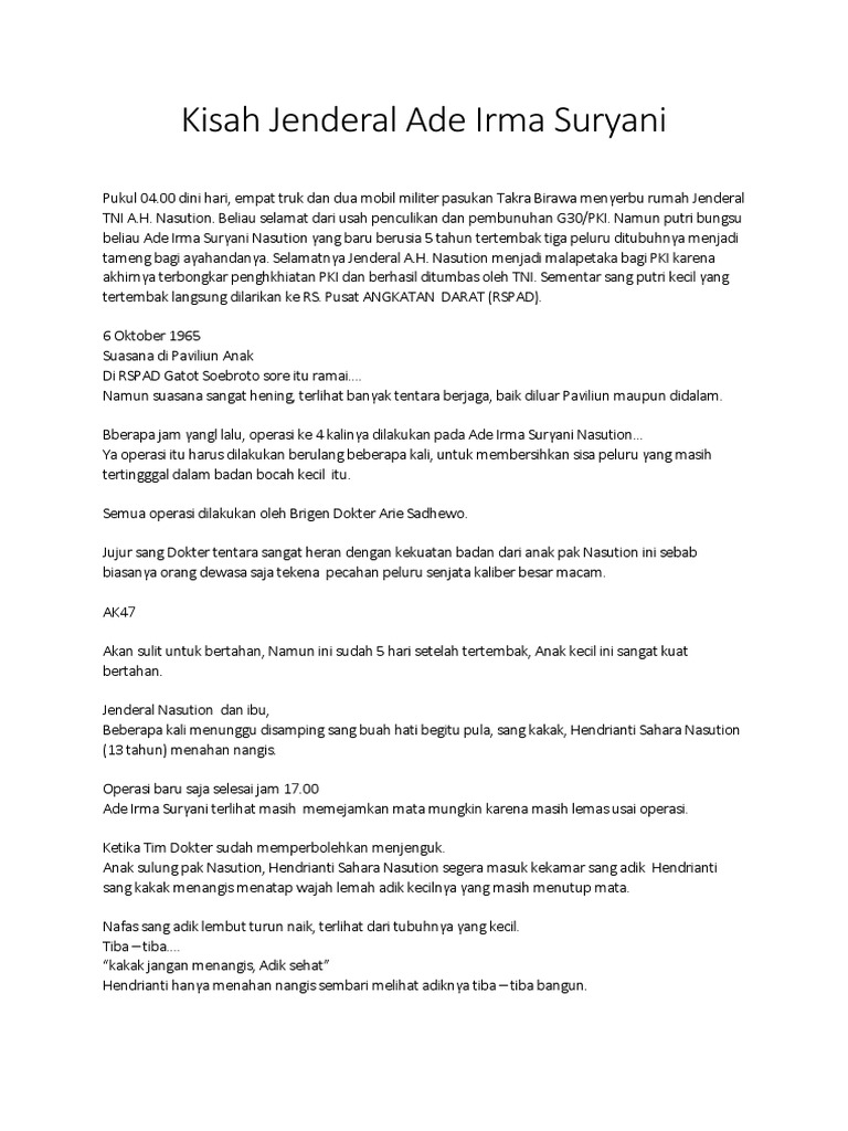 Ade irma suryani adalah putri bungsu dari jenderal ah nasution. Tribunjabarid ade irma suryani merupakan putri bungsu jenderal ah nasution. Saat itu ade irma yang belum genap berusia lima tahun tengah tidur bersama nasution dan istri johana soenarti di kamarnya. Sripokucom detik detik ade irma suryani menatap terakhir sang ayah ah nasution sesaat setelah tubuhnya tertembak peluru pasukan tjakrabirawa terungkap.