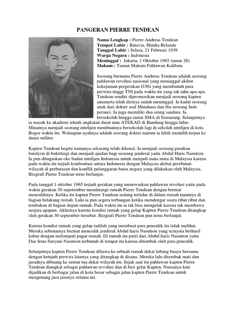 Pierre tendean biografi. Ia merupakan anak kedua dari tiga bersaudara buah perkawinan maria elizabeth cornet seorang wanita asal belanda berdarah perancis dengan seorang dokter spesialis kejiwaan keturunan minahasa bernama aurelius lammert tendean. Pierre andries tendean yang dirilis pada tahun 2018buku ini merupakan buku biografi pertama tentang pahlawan revolusi termuda yang gugur pada peritiwa gerakan 30 september 1965 tersebut yang terbit di era tahun 2000 an sekaligus menjadi buku pertama di. Sebuah biografi pierre tendean adalah sebuah buku biografi berlatar belakang sejarah indonesia tentang tokoh kapten czi. Al tendean seorang dokter yang berdarah minahasa dan maria elizabeth cornet seorang wanita belanda yang berdarah prancis pada tanggal 21 februari 1939 di batavia kini jakarta hindia belandapierre adalah anak kedua dari tiga bersaudara.
