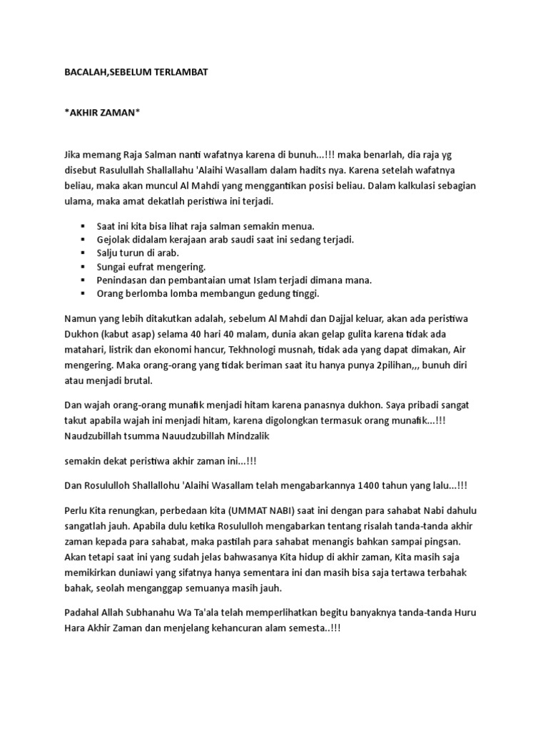 Raja salman akhir zaman. Ini kerana selepas para imam 7 dari seluruh pelusuk dunia akan membaiah imam mahdi di mekahjusteru akan datang sekumpulan tentera dari syam. Dari abu bashir dia mengatakan aku mendengar abu abdullah yakni al imam ashaddiq dia berkata siapa yang memberi jaminan kepada saya bahwa kematian abdullah raja saudi membuat keadaan menjadi aman. Justru raja abdullah yang beberapa kali disebutkan oleh nabi sebagai penanda kedatangan al mahdi. Akhir zaman arab saudi global hadis tiga putera akhir zaman imam mahadi khalifah allah al mahdi perang antara tiga putera raja putera mohammad bin salman qatar.