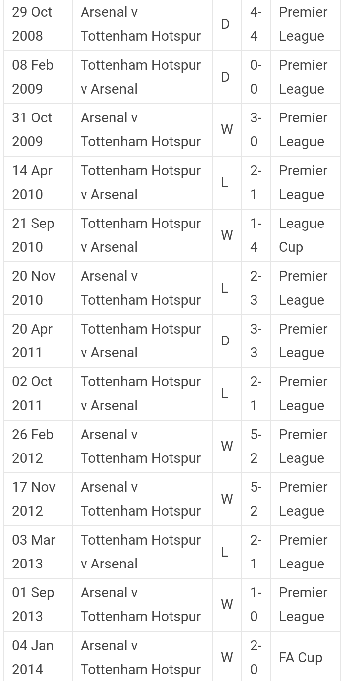 Tottenham hotspur results. View tottenham hotspur fc scores fixtures and results for all competitions on the official website of the premier league. Information from all competitions including dates and venues. The latest tottenham hotspur score can always be found here today at turboscores along with essential tottenham hotspur statistics news and more. Visit espn to view tottenham hotspur match results from all competitions along with a season by season archive.